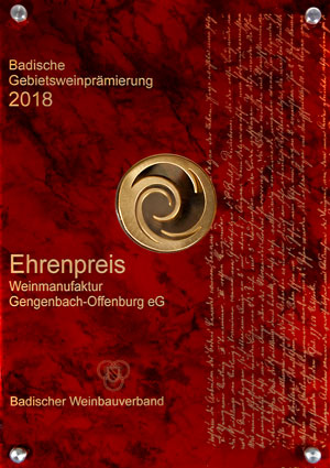 Bereits zum zweiten Mal nach 2016 wurde die Weinmanufaktur Gengenbach-Offenburg mit dem Staatsehrenpreis für herausragende Weinqualität ausgezeichnet. In der Landesvertretung Baden-Württemberg in Berlin bekam die Delegation aus der Ortenau den Staatsehrenpreis für Weinbau 2019 von der Staatssekretärin im Ministerium für Ländlichen Raum und Verbraucherschutz Baden-Württemberg, Friedlinde Gurr-Hirsch verliehen.